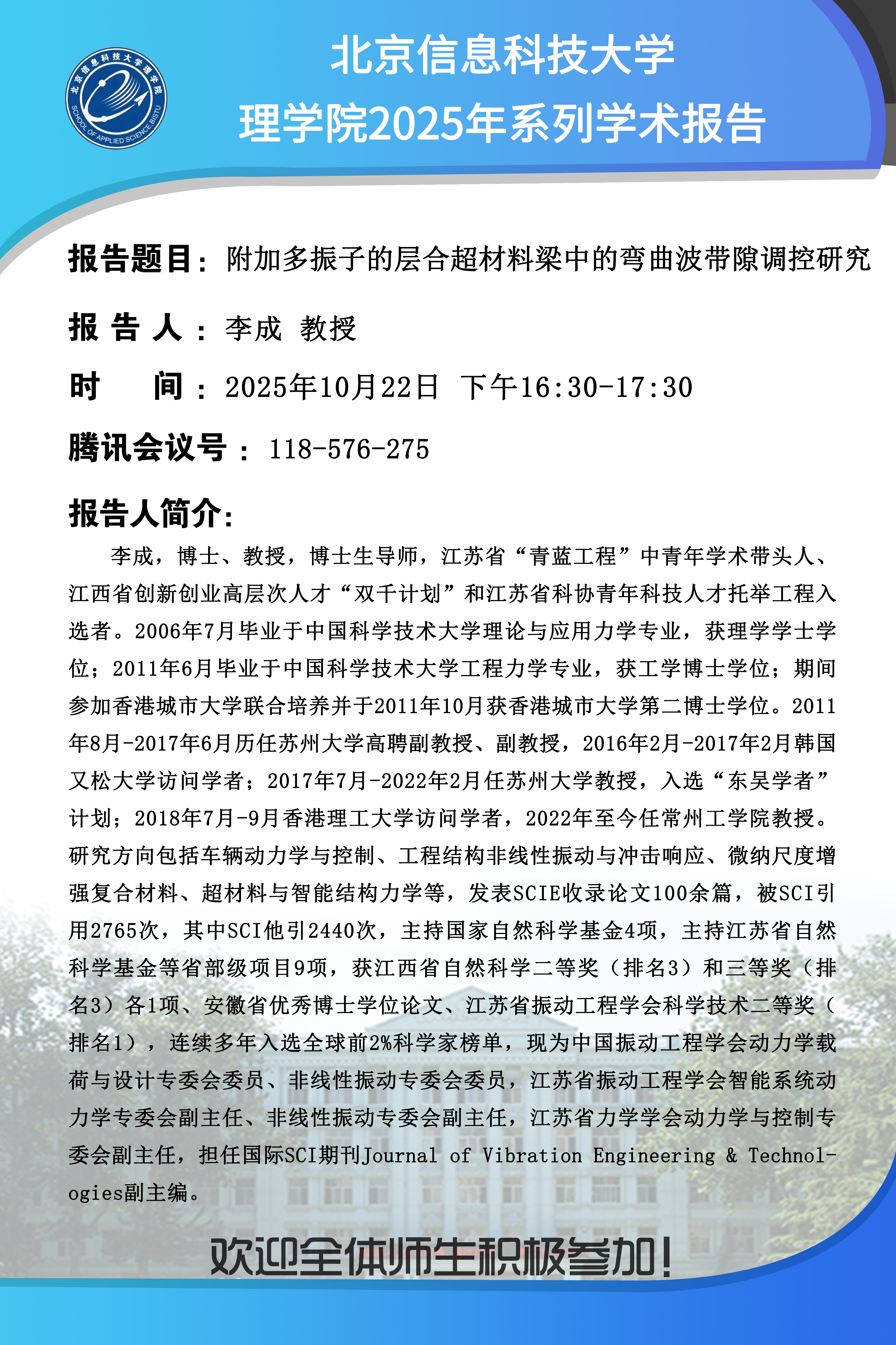 - 2025-10-21 报告题目:附加多振子的层合超材料梁中的弯曲波带隙调控研究 报告人:李成教授 时 间:2025年10月22日