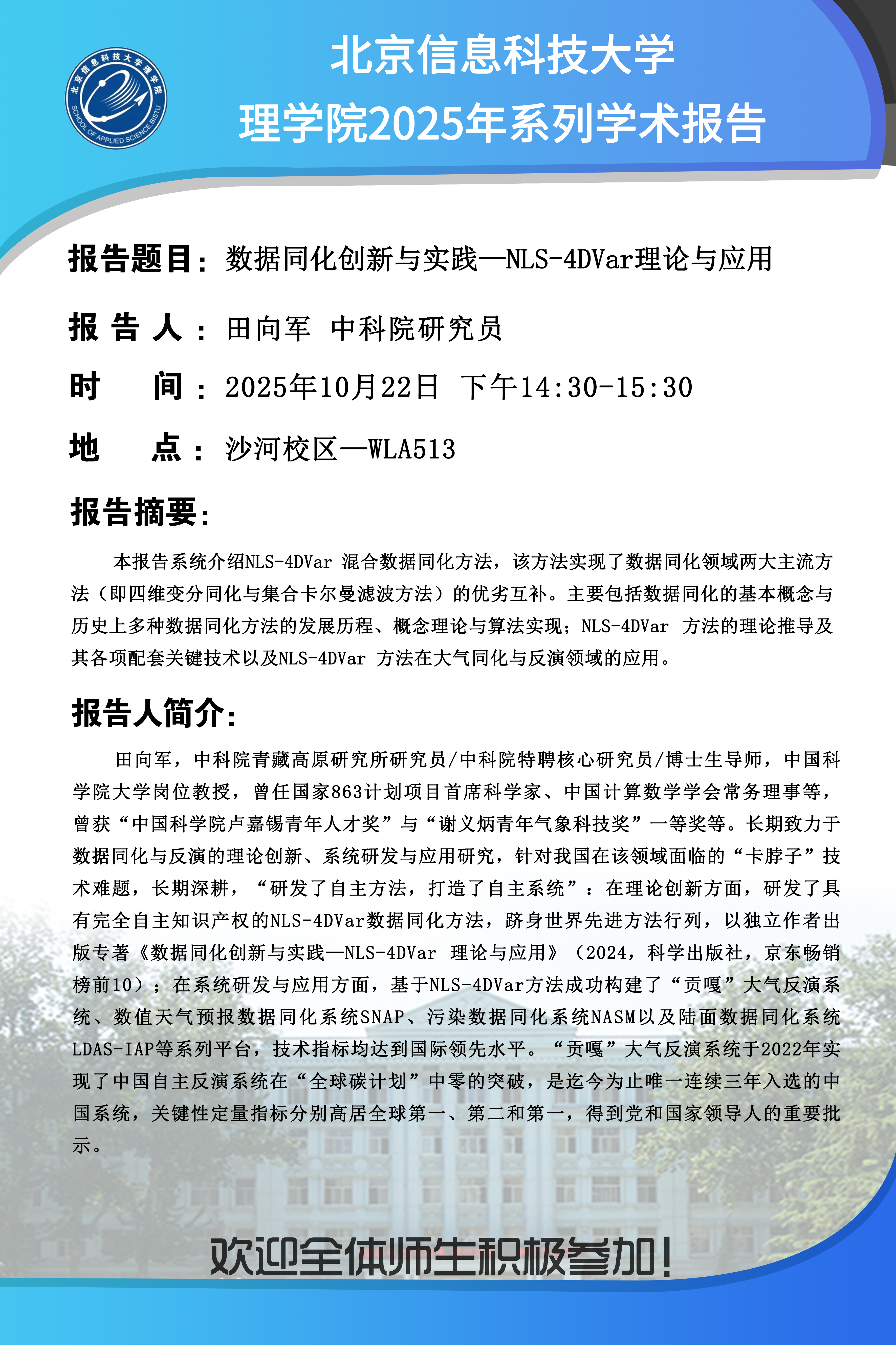 - 2025-10-21 报告题目:数据同化创新与实践-NLS-4DVar理论与应用 报告人:田向军中科院研究员 时 间:2025年10月22日
