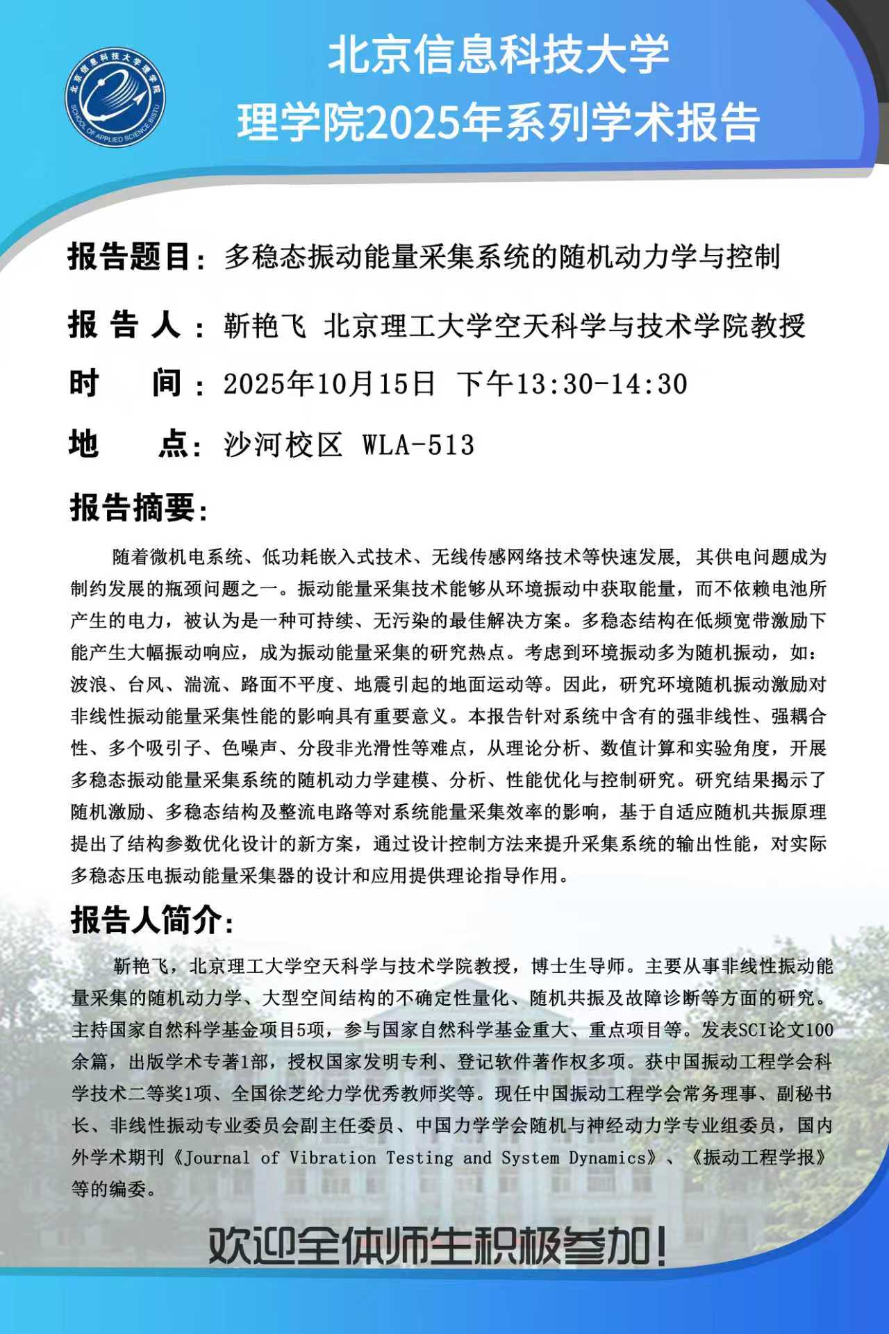 - 2025-10-14 报告题目:多稳态振动能量采集系统的随机动力学与控制 报告人:靳艳飞北京理工大学空天科学与技术学院教授 时 间:2025年10月15日