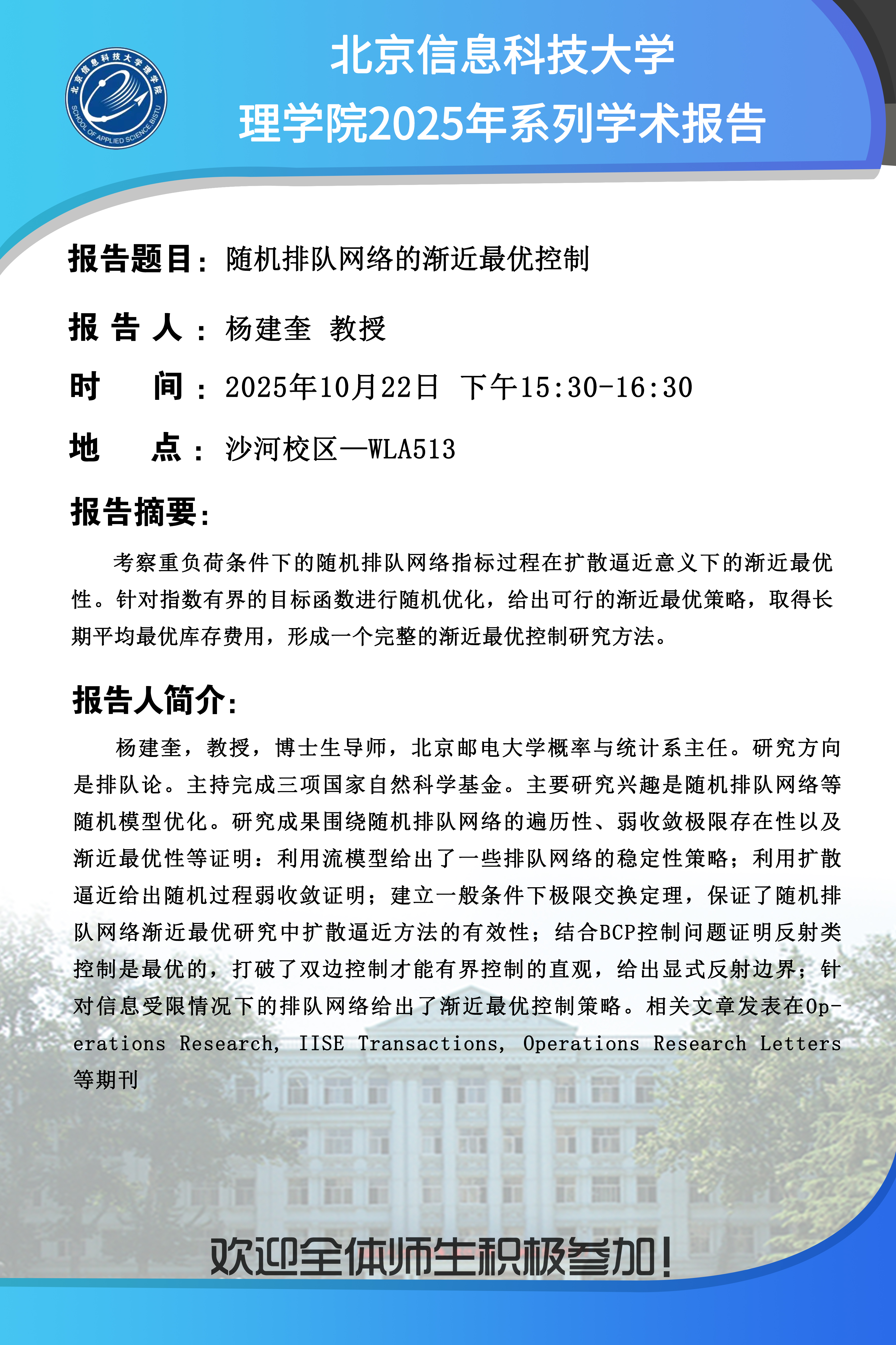 - 2025-10-21 报告题目:随机排队网络的渐近最优控制 报告人:杨建奎教授 时间:2025年10月22日