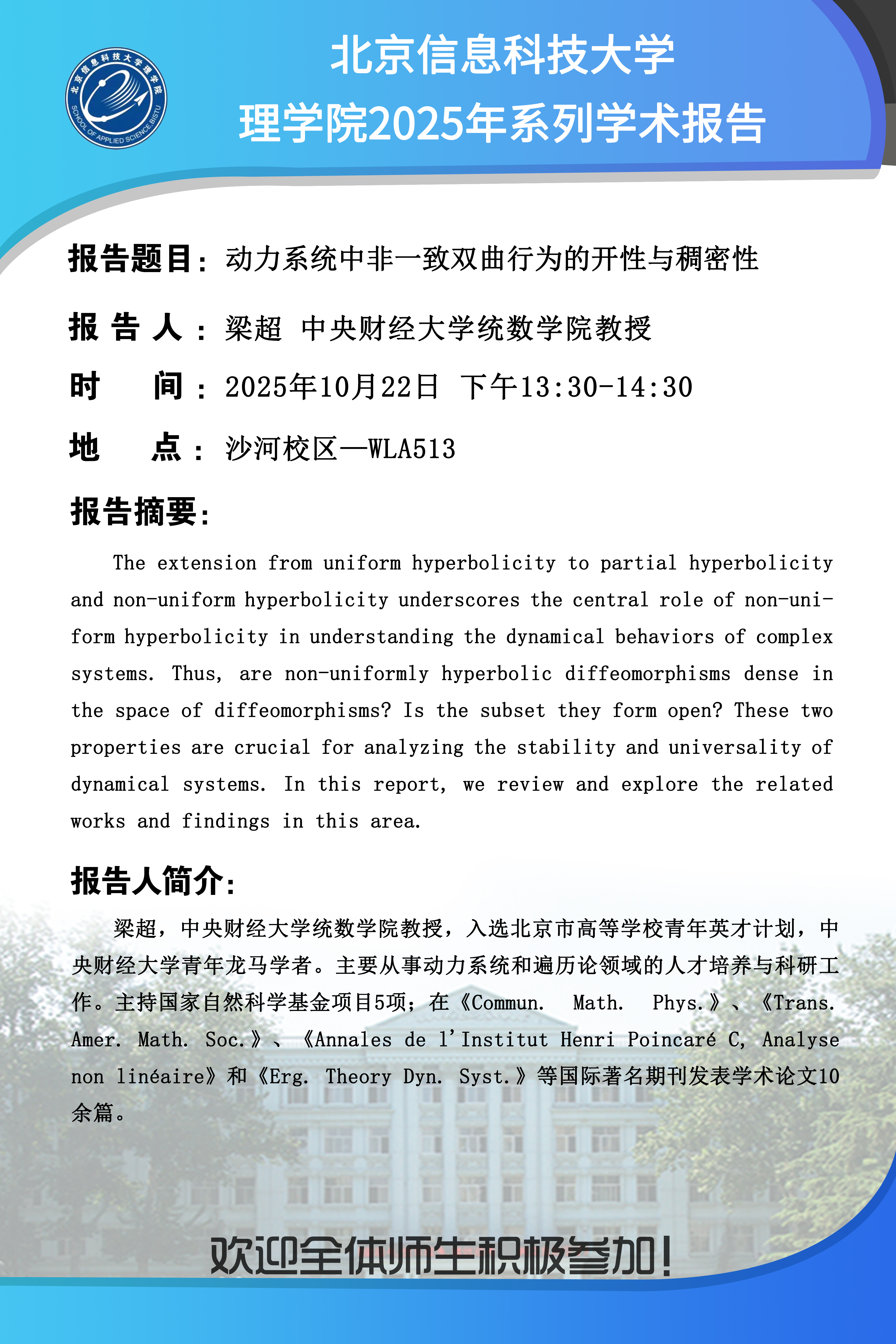 - 2025-10-21 报告题目:动力系统中非一致双曲行为的开性与稠密性 报告人:梁超中央财经大学统数学院教授 时 间:2025年10月22日