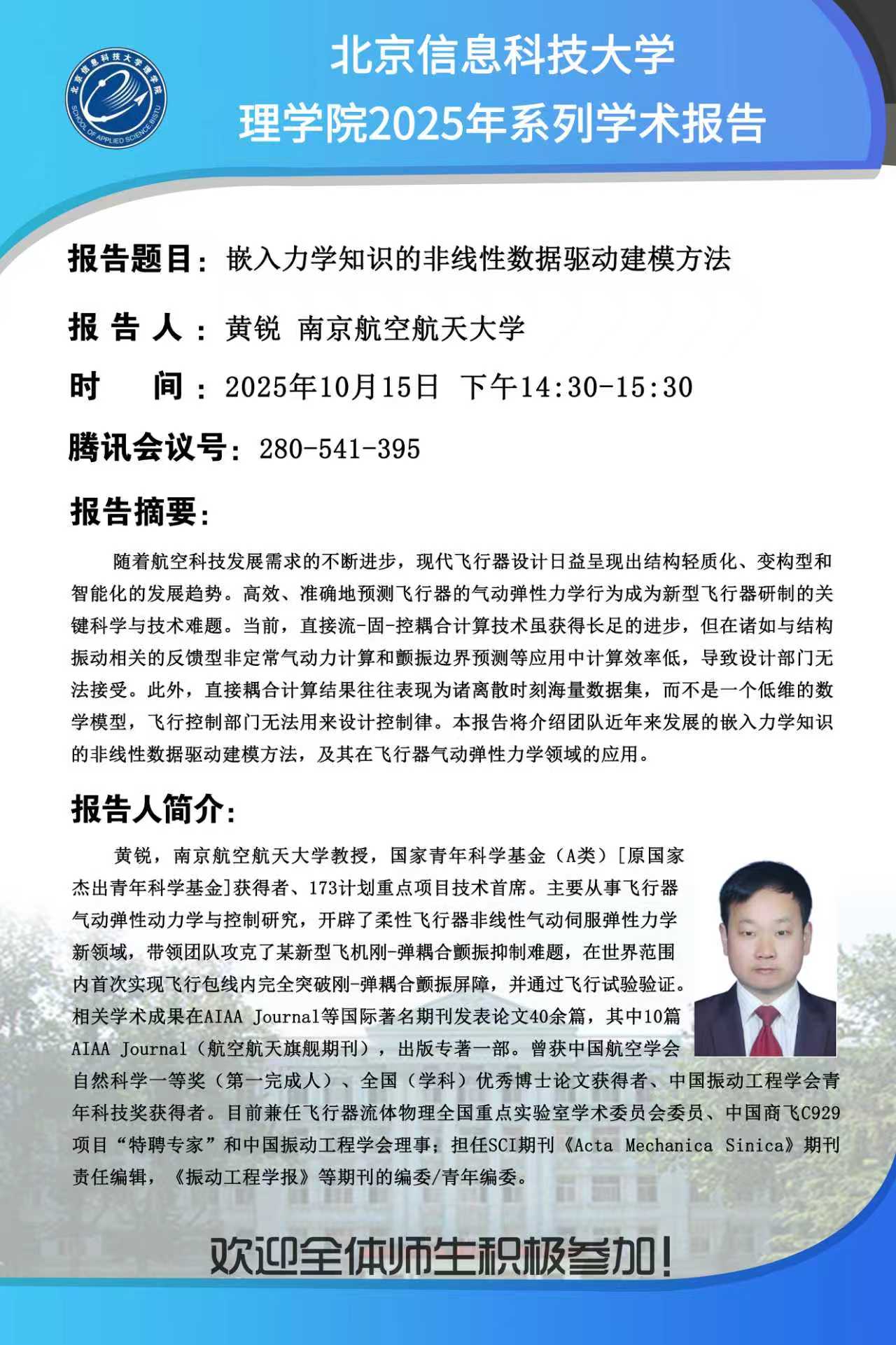 - 2025-10-14 报告题目:嵌入力学知识的非线性数据驱动建模方法 报告人:黄锐南京航空航天大学 时间:2025年10月15日下