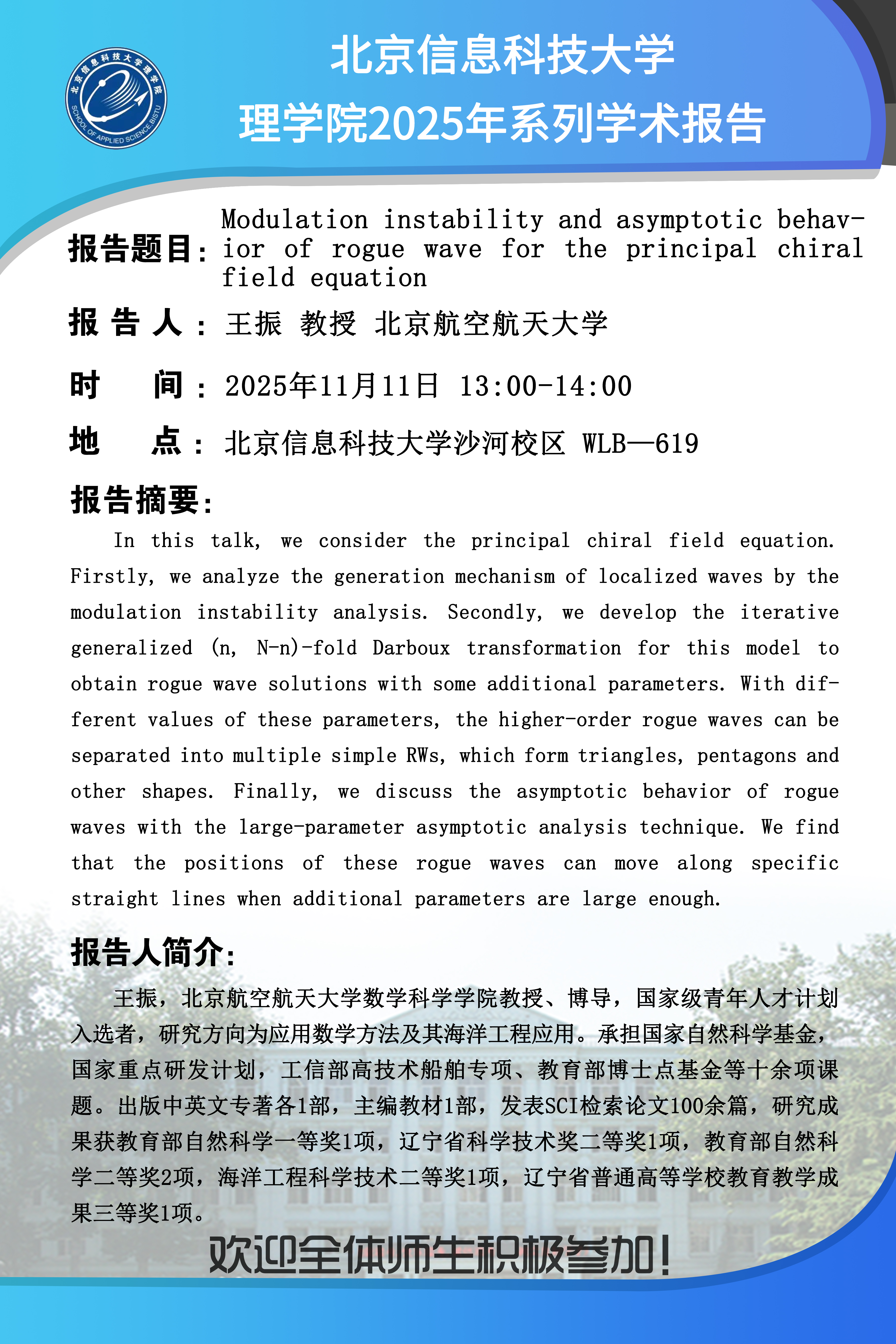- 2025-11-10 Modulation instability and asymptotic behavior of rogue wave for the principal chirafield equation(王振 北京航空航天大学)