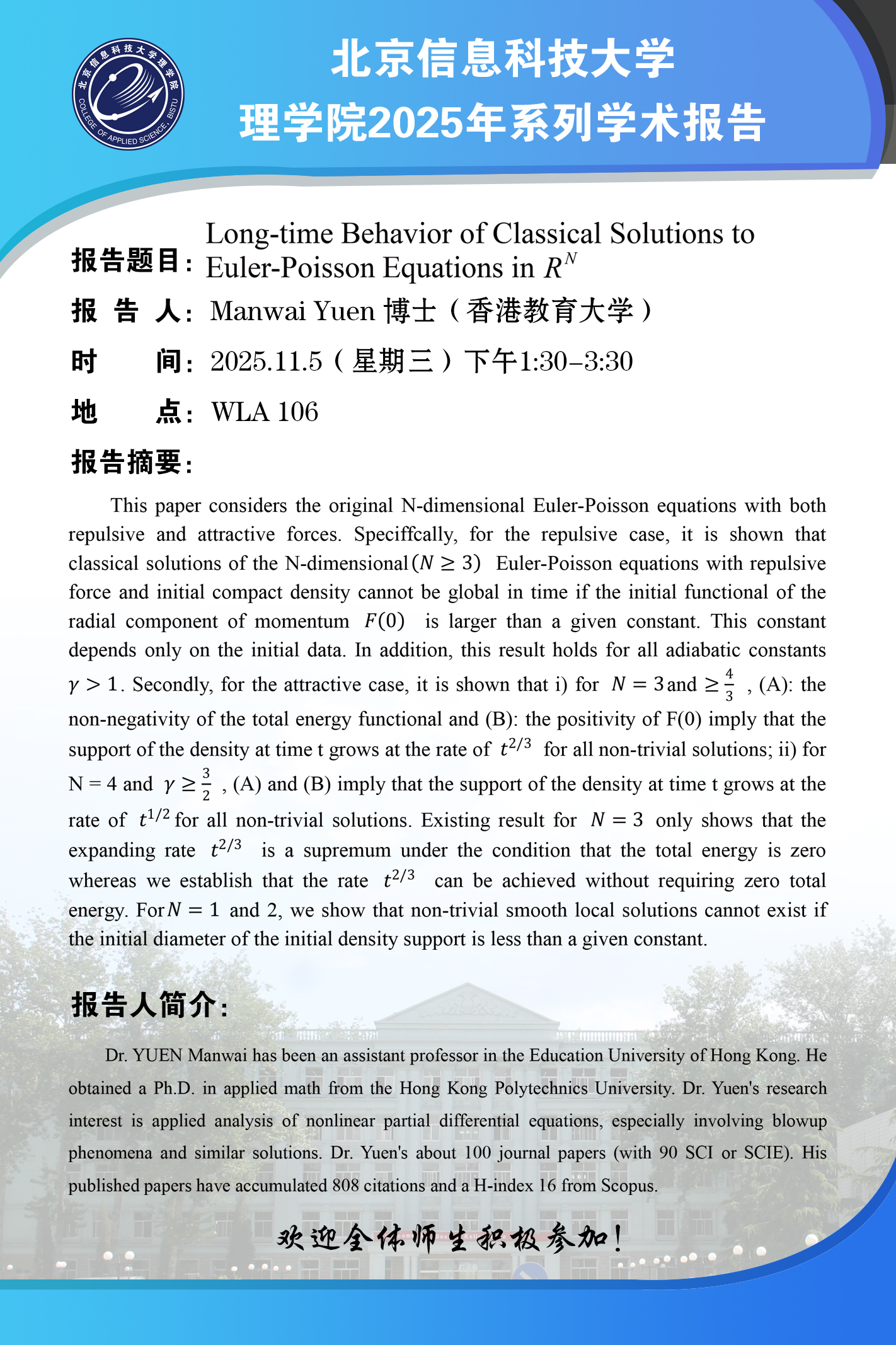 - 2025-11-05 Long-time Behavior of Classical Solutions to Euler-Poisson Equations in RN(Manwai Yuen 香港教育大学)