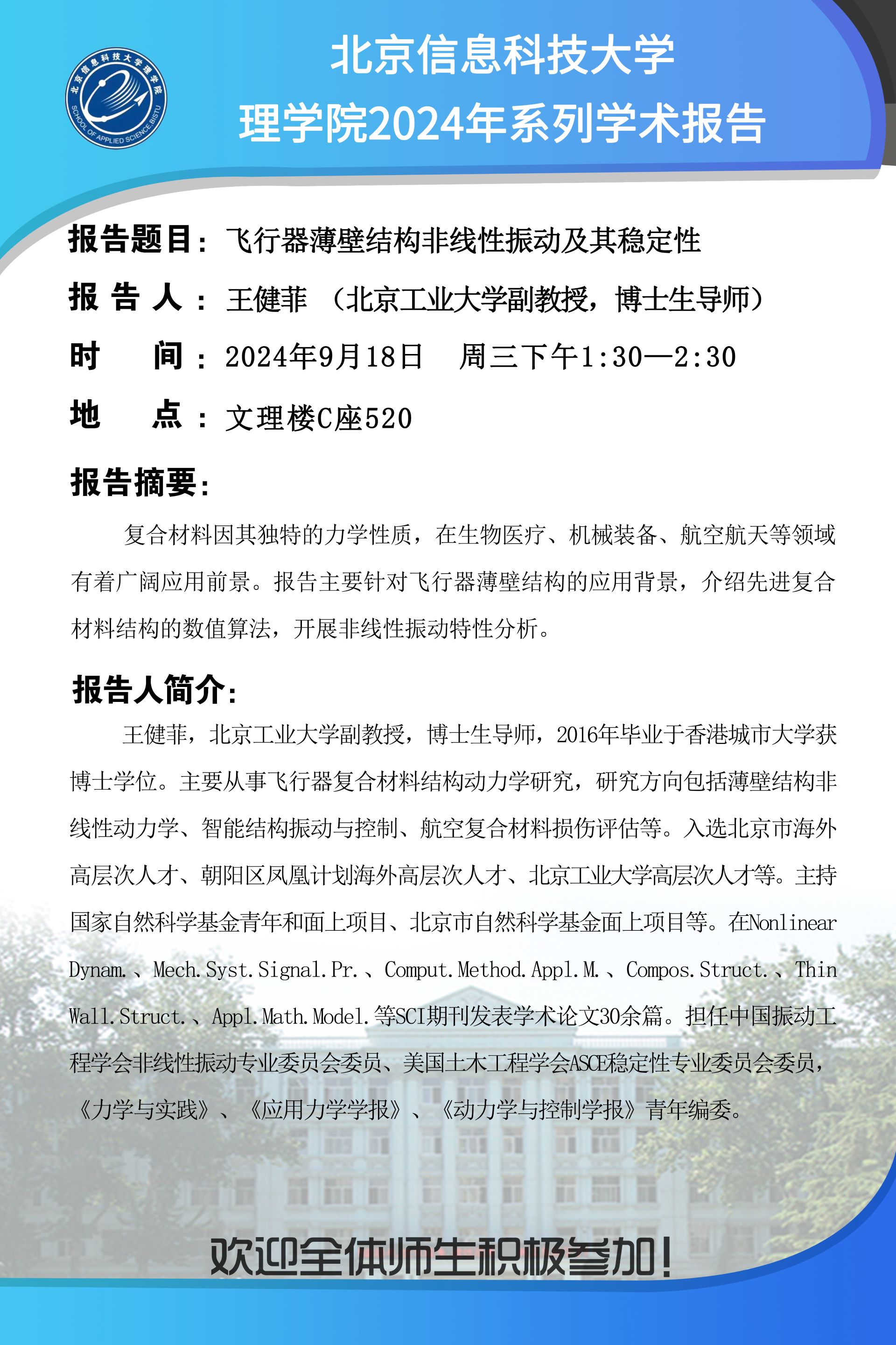 - 2024-10-18 飞行器薄壁结构非线性振动及其稳定性 (王健菲 副教授 北京工业大学)