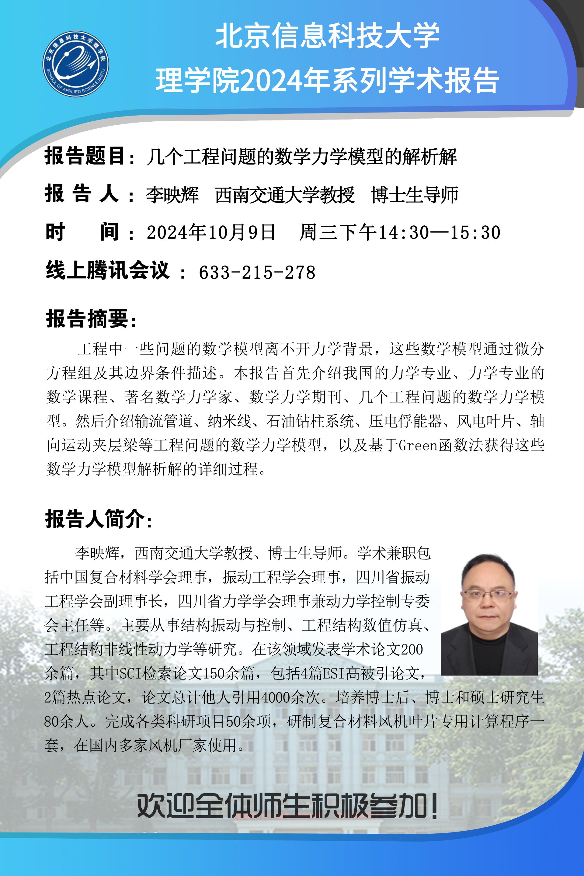 - 2024-10-18 几个工程问题的数学力学模型的解析解(李映辉 教授 西南交通大学)