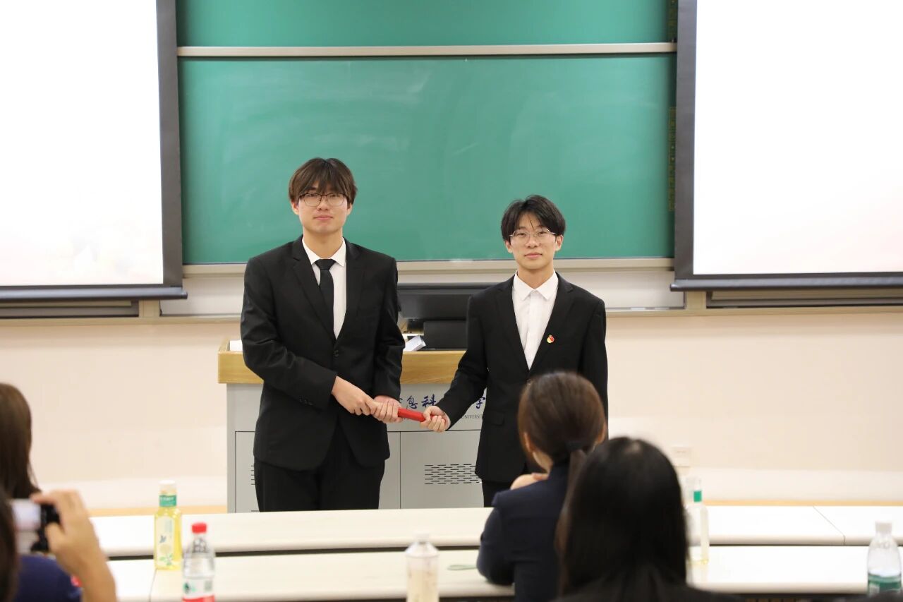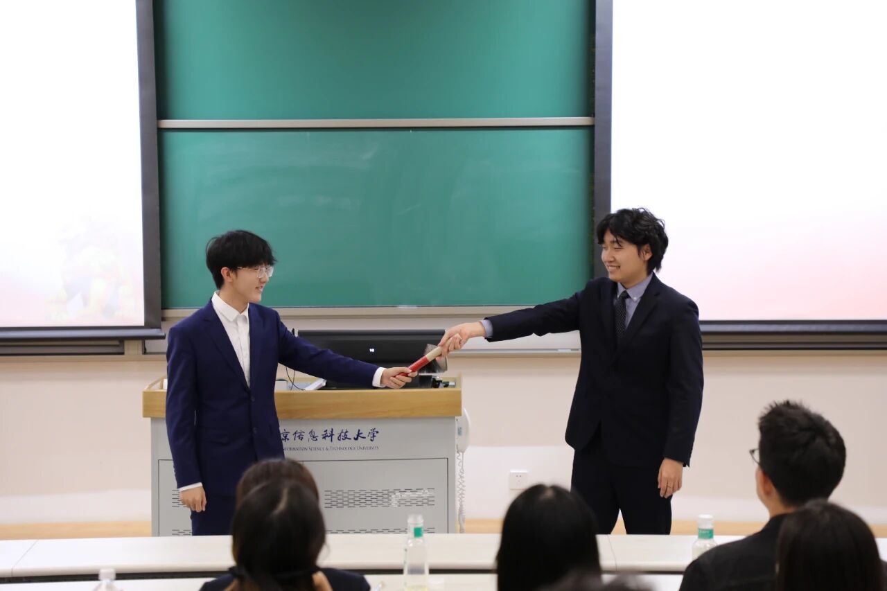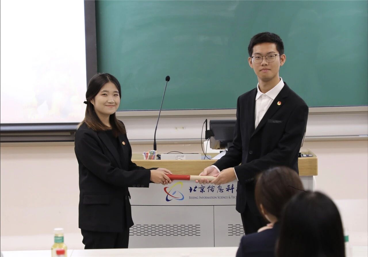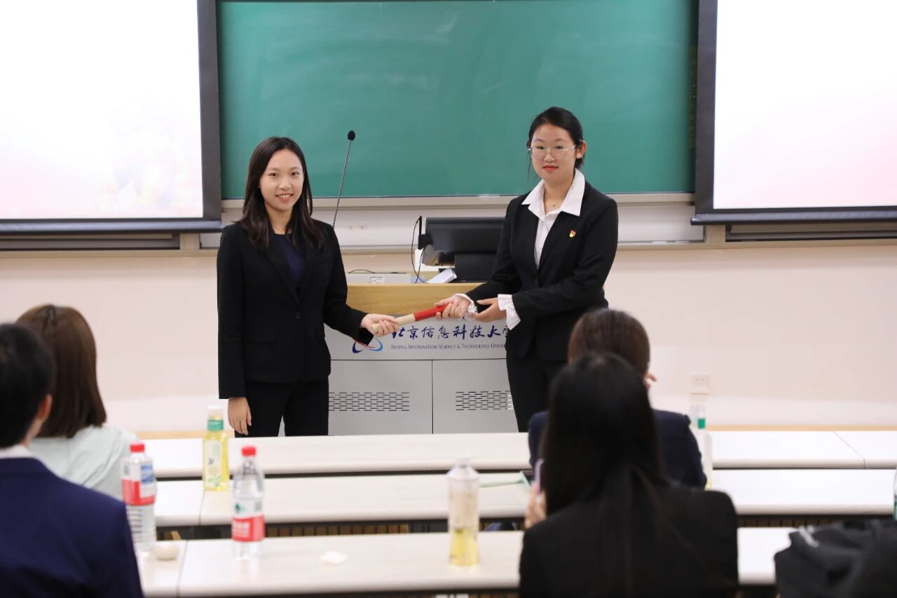 随后进入核心交接环节:新一届学生会执行主席王硕、团委副书记武嘉硕、新闻中心主任王欣灵、学生事务服务中心主任屈佳胜依次上台,从老一届代表手中接过接力棒,完成责任与使命的传递。四位新代表在发言中承诺,将秉承“服务同学、锻炼自我”宗旨,为学院学生组织注入新活力。