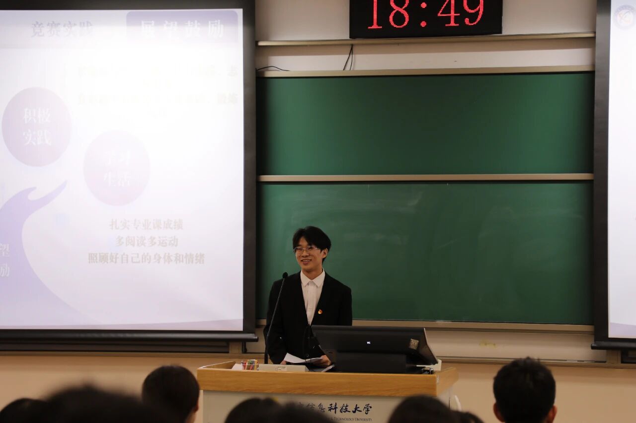 大会伊始,全体起立奏唱国歌,庄重的旋律拉开换届序幕。随后,第十八届学生组织代表分享经验:团委副书记梁娅妮回顾团委工作点滴,学生事务服务中心主任雷明豪讲述服务同学的实践心得,二人结合自身经历为新一届干部传经送宝,言语间满是对组织发展的期许。